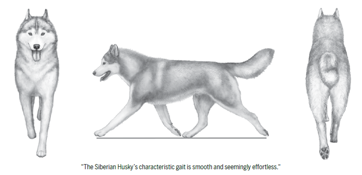 A szibériai husky jellegzetes járásmódja egyenletes és láthatólag könnyed. Gyors és könnyű lábú. Amikor a kutya a kiállítási ringben laza vezetéssel közepesen gyorsan üget, az első végtagok mozdulatai tért ölelőek, és a hátsó végtagok mozgása jól irányzott. Séta ütemű járáskor elölről hátrafele nézve a láb nem egyenes vonalú, de ahogy nő a sebesség, úgy a lábak egyre inkább befelé hajlanak, míg a talppárnák pontosan a törzs hosszanti középpontja alá esnek. Amikor a talppárnák összefutnak, az első és hátsó lábak egyenesen előre haladnak, sem a könyökök, sem a combvonalak nem fordulnak befelé vagy kifelé. Mindkét hátsó láb az elülső lábak irányát követi. Ügetéskor a kutya hátvonala határozott és egyenes marad.